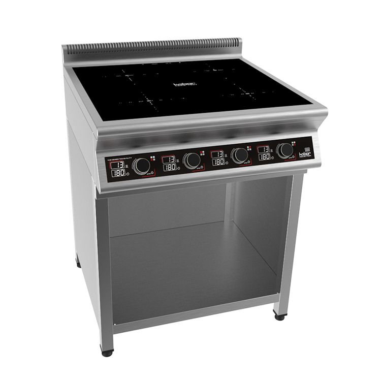 800х900х870 Плита индукционная на полузакрытой подставке, 4 конфорки мощностью 4х3,5кВт, электронная панель управления с цифровой индикацией, 13 уровней нагрева, таймер до 180мин., съемный жировой фильтр, корпус из н.с. AISI 304, регулируемые по высоте ножки, рабочая поверхность - стеклокерамика 6мм, 14 кВт, 380В.